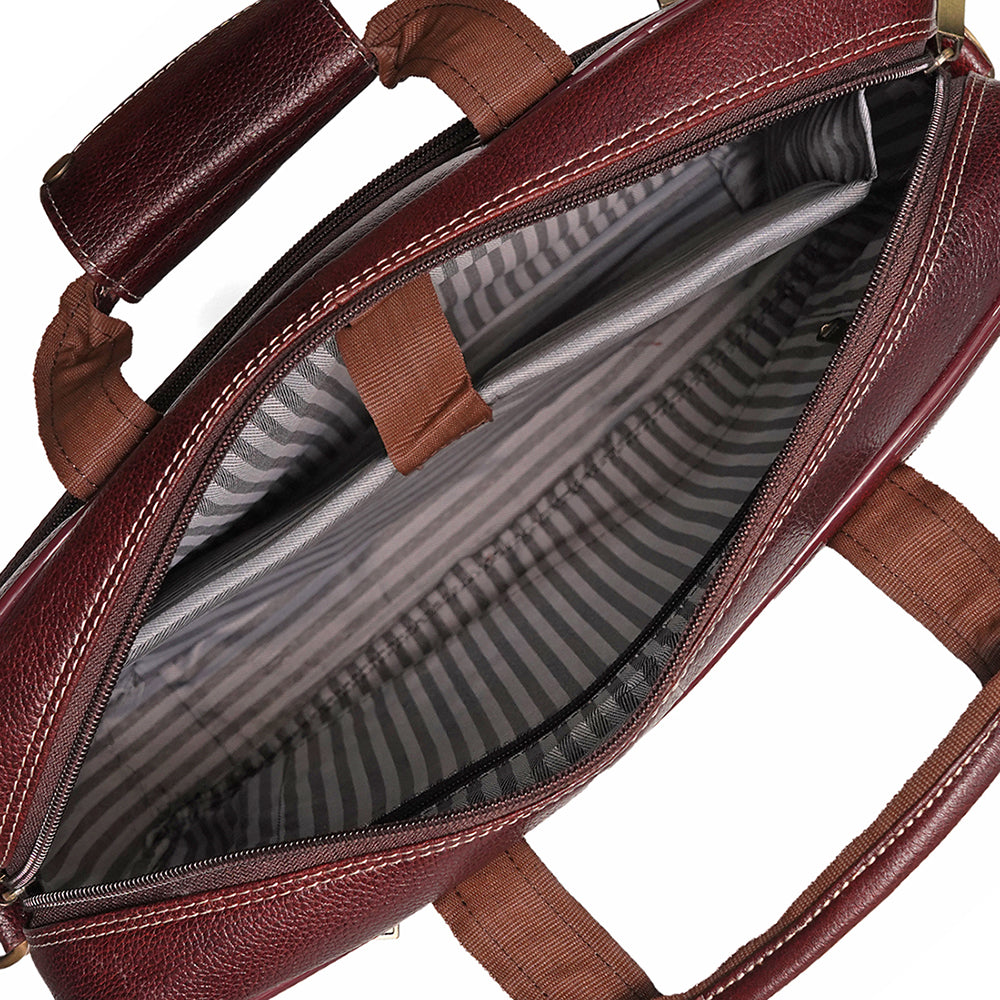 This laptop bag consists of 1 main spacious compartment and 1 front compartment, 1 laptop compartment, 1 inside pocket,1 back pocket ,2 front pockets 2 handles and 1 detachable and adjustable sling strap.