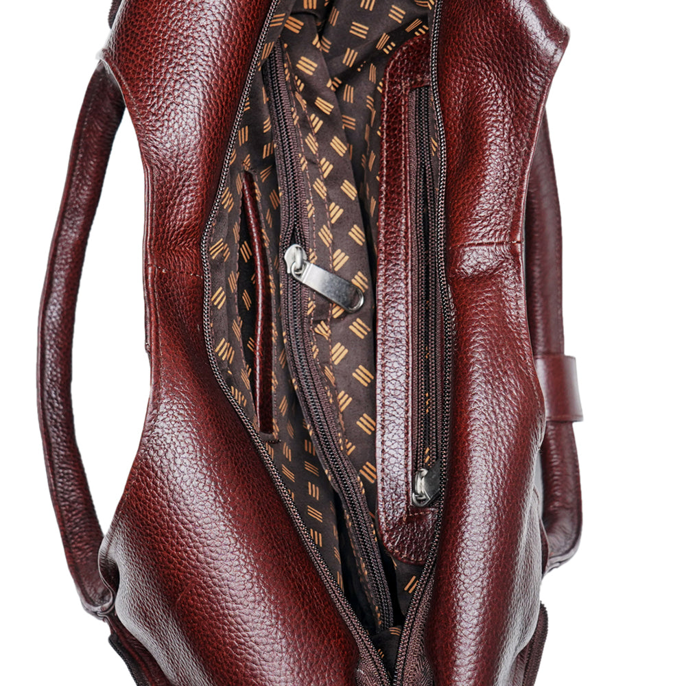 This bag consists of 2 Inner compartments, 1 outer chain pocket, 1 secret chain pocket,1 slip pocket, 1 center divider pocket and 2 handles.