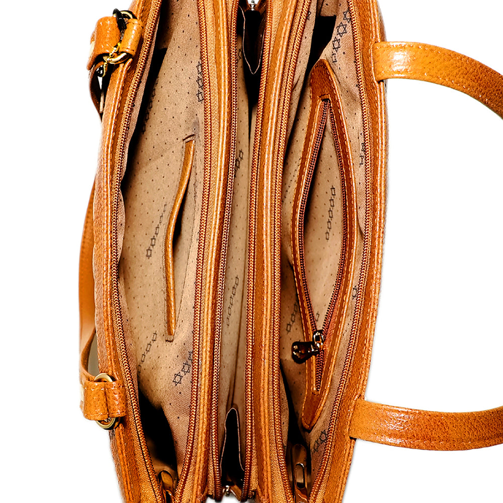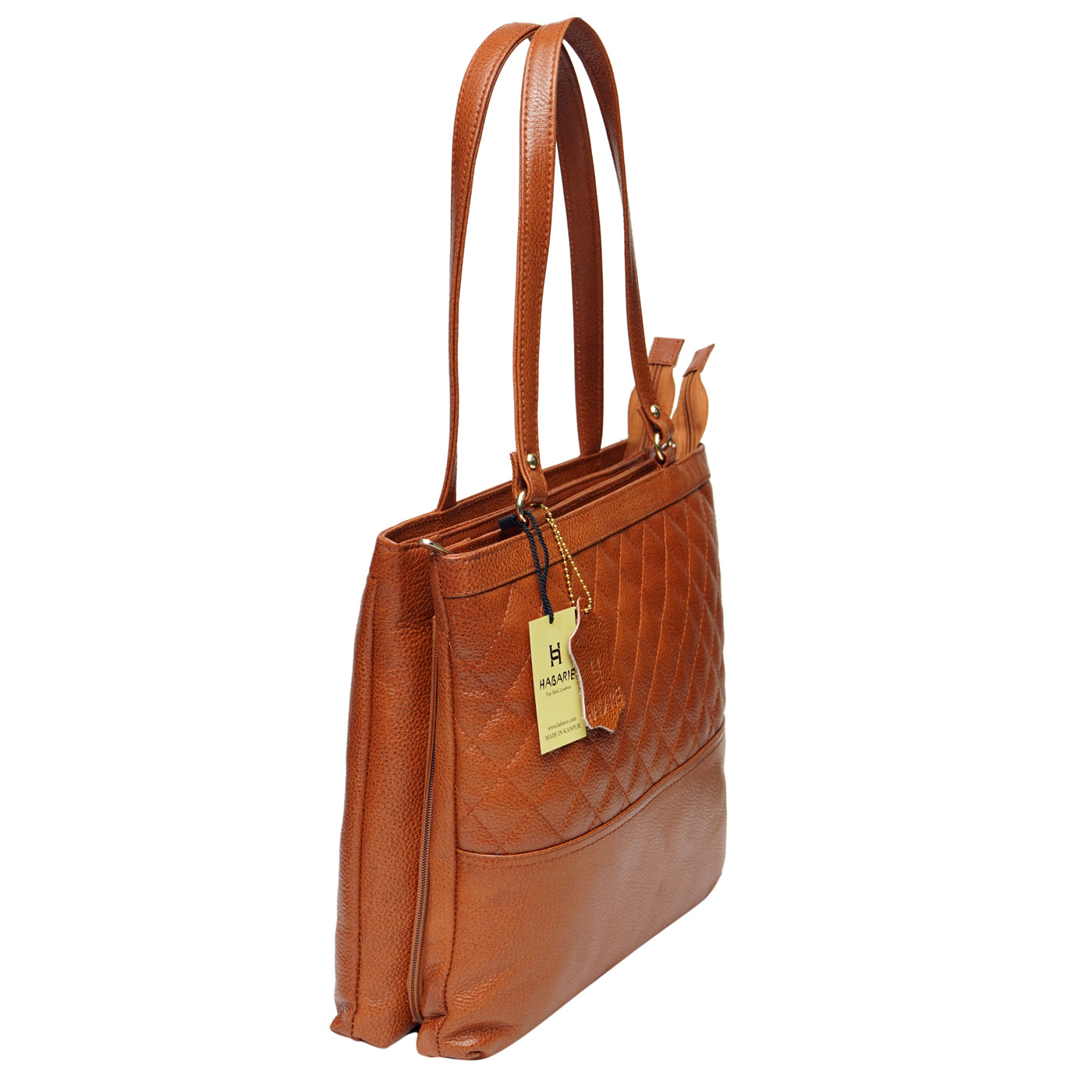 This Handbag Consists of 2 Inner compartments with a file compartment, 1 secret chain pocket and one slip pocket and 2 handles.