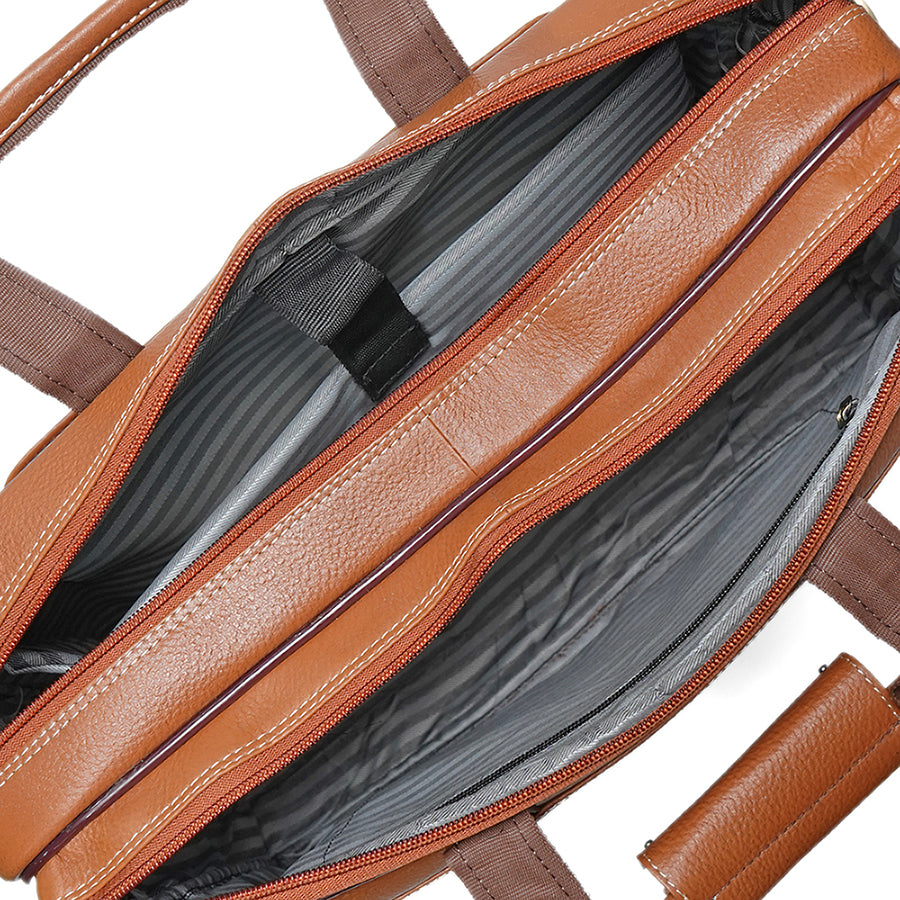 This laptop bag consists of 2 main spacious compartments and 1 front compartment, 1 laptop compartment, 1 inside pocket,1 back pocket, 2 handles and 1 detachable and adjustable sling strap